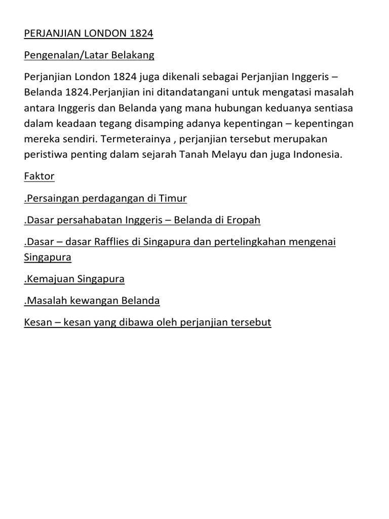 Perjanjian london 1824 dan kesannya terhadap alam melayu. Perjanjian ini ditandatangani untuk mengatasi masalah antara Inggeris dan Belanda yang mana hubungan keduanya sentiasa dalam keadaan tegang di samping adanya kepentingan-kepentingan mereka sendiri. Rumusan perjanjian london 1824 voooty.